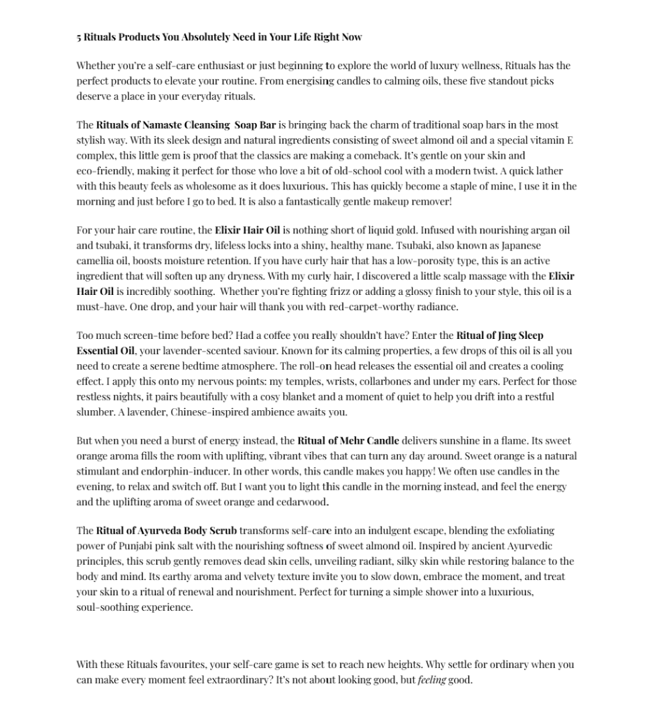 This review highlights my expertise in connecting with readers through personal, relatable beauty writing. Drawing from my own experience using the product, I share how it has transformed my routine and delivered real results. By weaving in my journey—how it’s enhanced my skin, hair, or overall confidence—I create an authentic narrative that resonates with readers seeking products that truly work.
